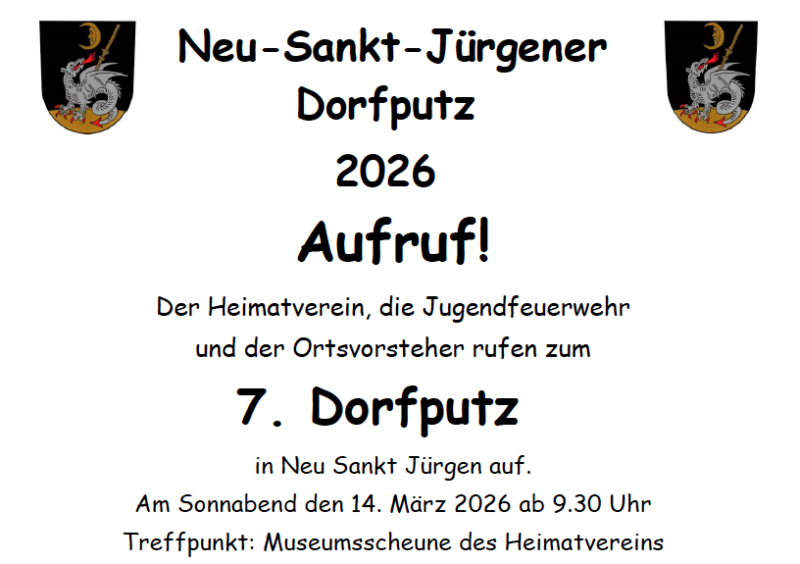Am Sonnabend den 14. März 2026 ab 9.30 Uhr treffen wir uns an der Museumsscheune und werden in Gruppen in Neu Sankt Jürgen die Plätze, Straßen und Flächen im Dorfe reinigen.