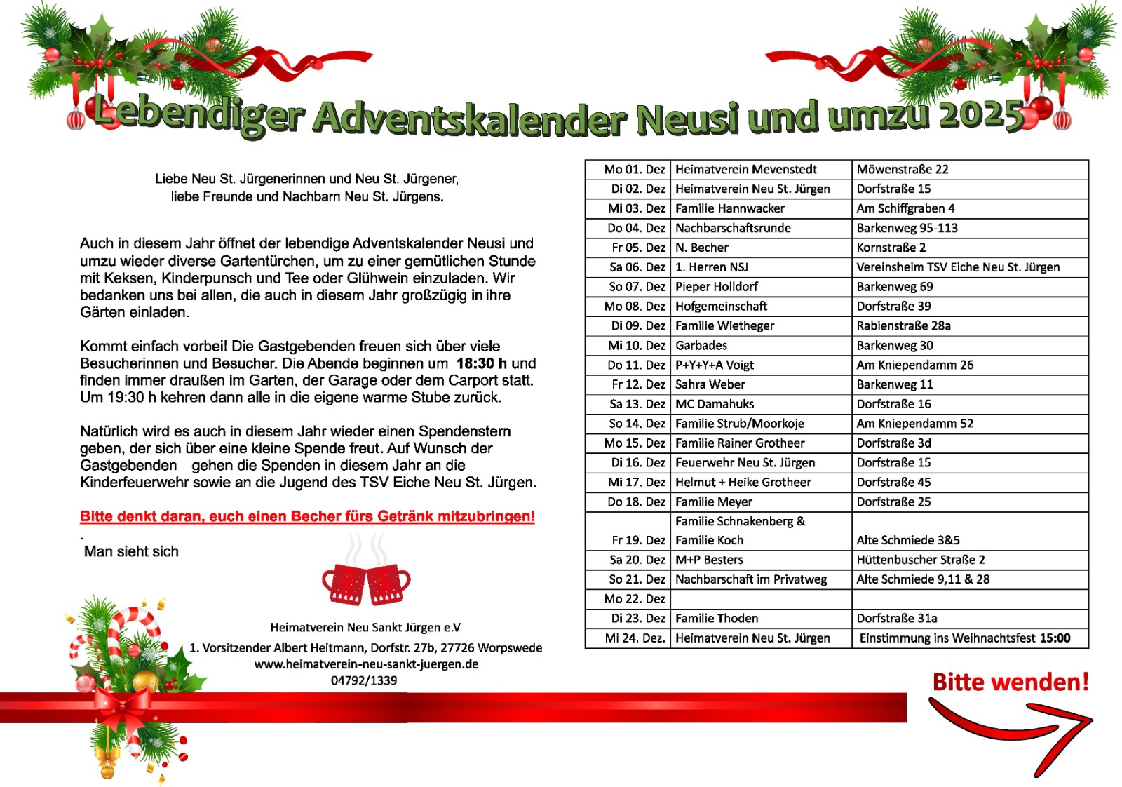 Auch in diesem Jahr geht die Idee des lebendigen Adventskalenders weiter. Ihr habt euch bereit erklärt, in diesem Jahr eure Gärten für den Adventskalender zu öffnen. Die Termine werden per Flyer an alle Haushalte in Neu St. Jürgen bekannt gegeben.